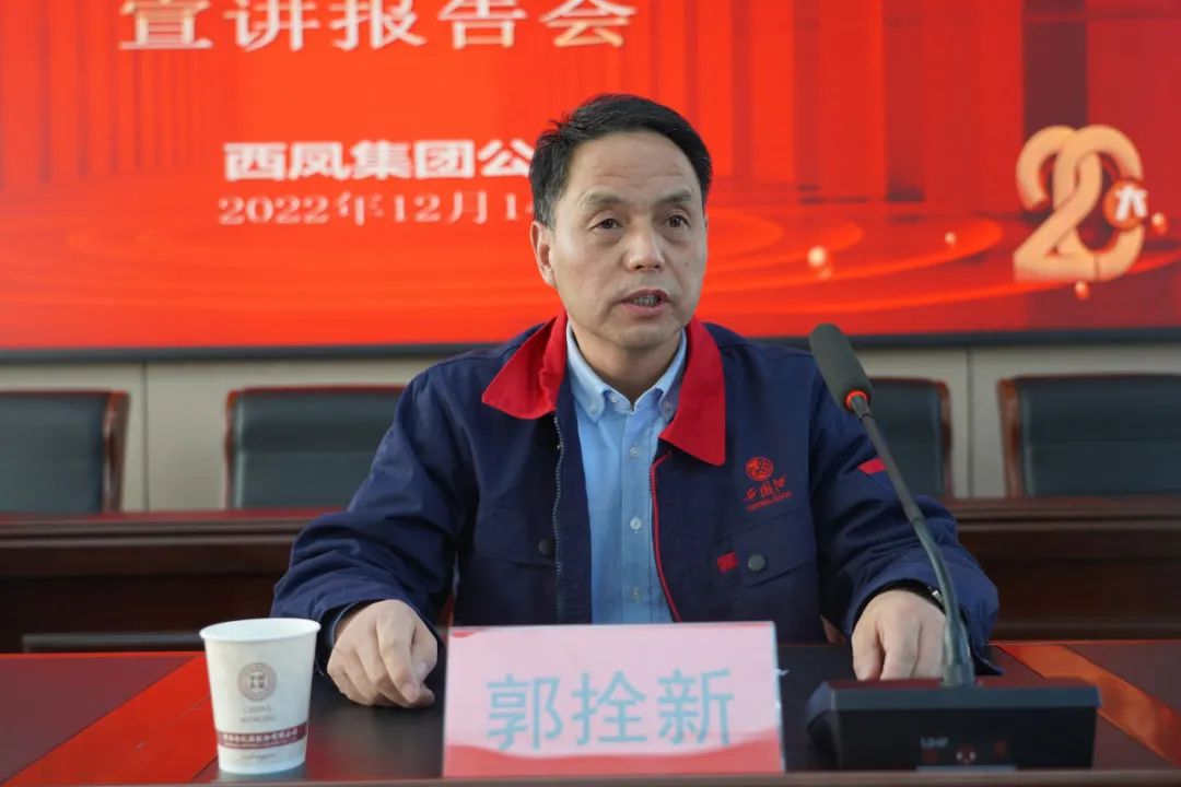 12月14日,西凤集团公司召开党的二十大精神专题宣讲会。西凤集团公司党委书记、董事长,股份公司董事长张正,公司领导班子成员,各党支部书记、基层联系点所在支部党员、党委系统工作人员共70余人参加会议。集团公司党委副书记郭拴新主持会议。