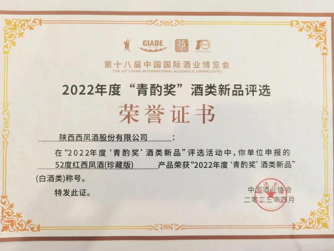 4月13日,中国酒业协会发布2022年度“青酌奖”酒类新品榜单,西凤酒战略产品五星红西凤【52度红西凤酒(正藏版)】荣膺2022年度青酌奖“酒类新品”称号。同时,西凤酒参赛作品“西凤酒·河”,荣获2023最美酒瓶设计大赛,概念设计组三等奖。