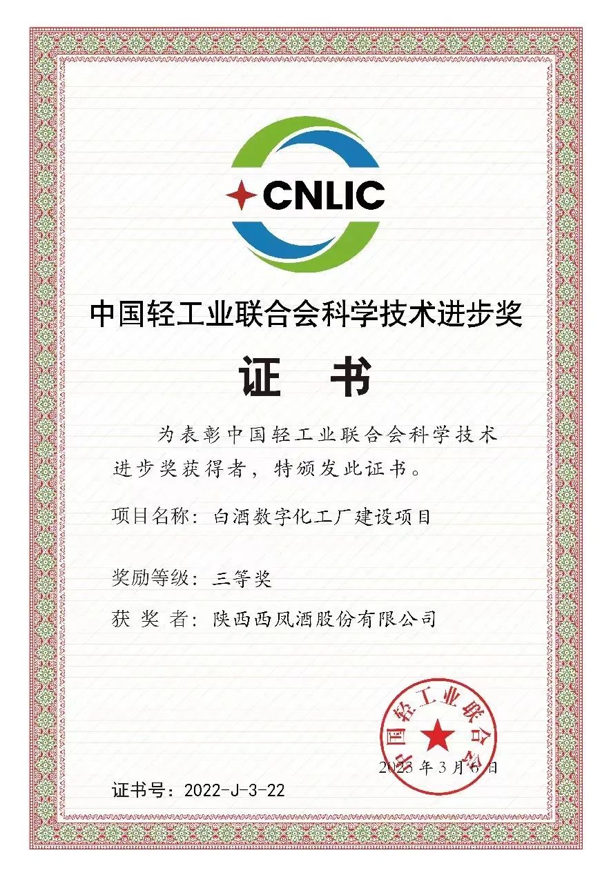 西凤股份公司“白酒数字化工厂建设”项目荣获2022年度中国轻工业联合会科学技术进步三等奖