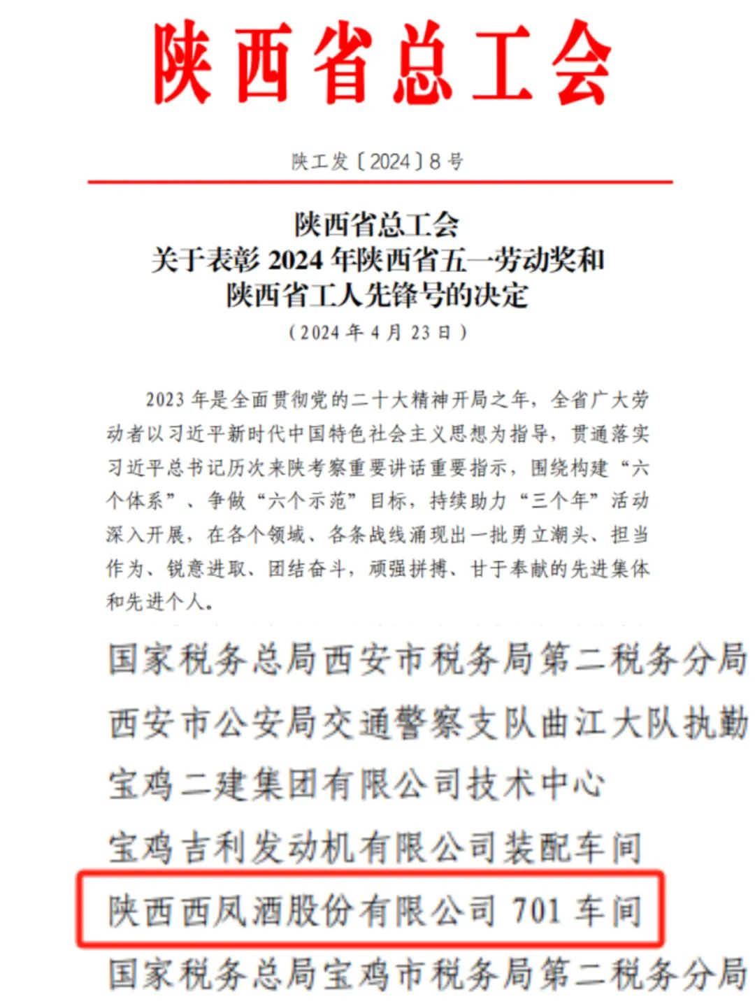 喜报|西凤股份公司701车间荣获“陕西省工人先锋号”