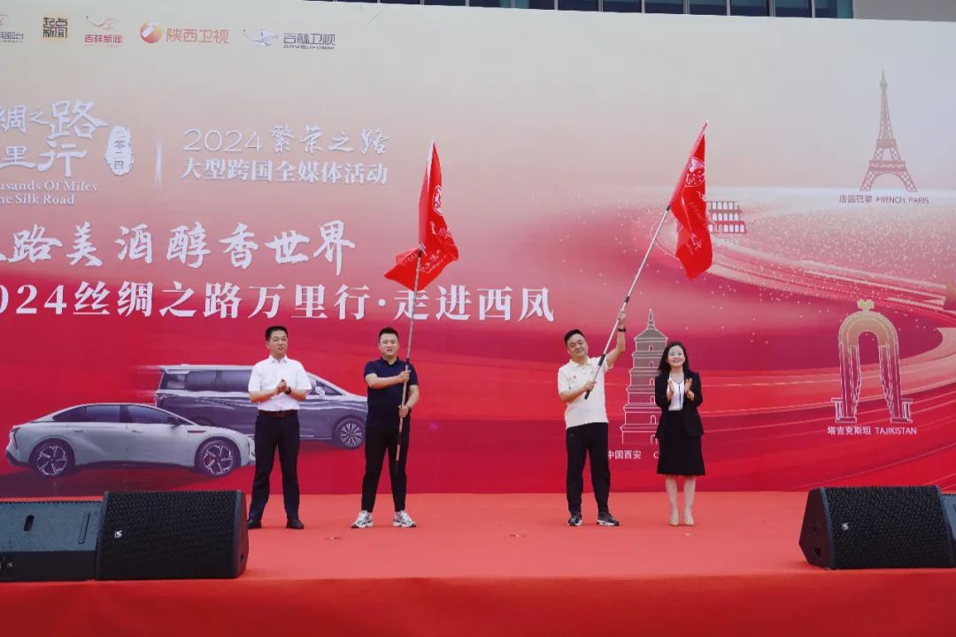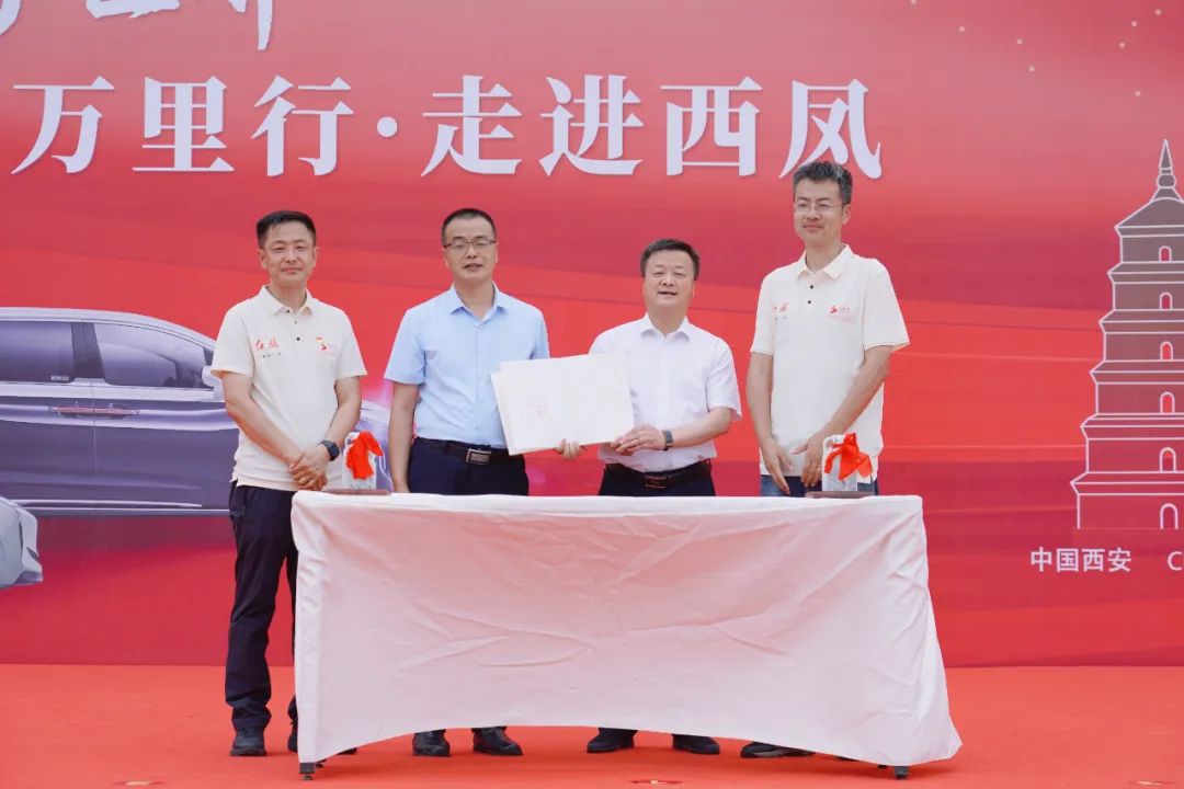 高亚兰、肖宁为西凤代表和车队代表授旗;张凡,冯雅芳为丝路万里行全媒体团队长罗强、副队长杨文萌,以及8名团员代表敬壮行酒。