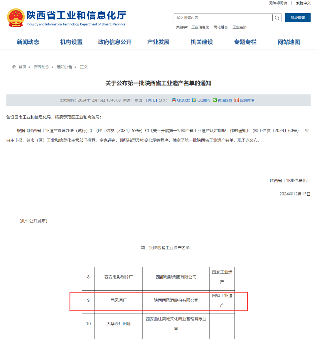 喜报丨西凤酒酿酒工业遗产群荣列陕西省第一批工业遗产名单