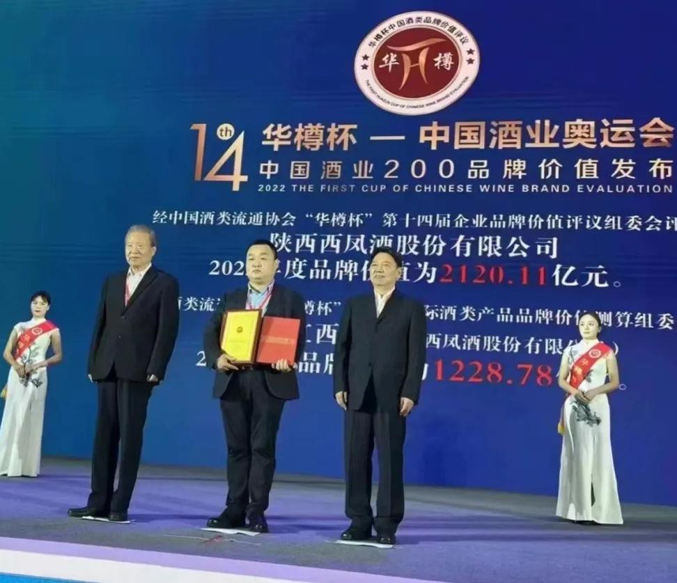 2022年11月10日,“华樽杯”第十四届中国酒类企业品牌价值暨第五届国际酒类产品品牌价值发布会在贵阳举行。西凤酒以2120.11亿元的品牌价值名列中国白酒品牌榜前列,被授予“中国最受欢迎凤香型白酒品牌”、“全球烈酒十强品牌”、“中国陕西省白酒品牌价值第一名”等多项荣誉。“红西凤”以1228.78亿元的品牌价值位列全球酒类产品第十三名。