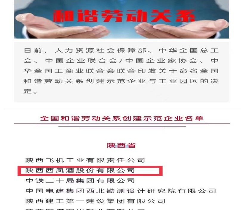 西凤股份公司荣获“全国和谐劳动关系创建示范企业”称号