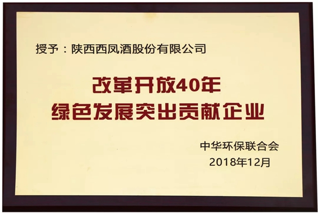 近日,在中华环保联合会组织的“开展纪念改革开放40年中国企业绿色发展成就主题活动”中,西凤股份公司因在绿色发展、生态文明、环境保护、节能减排等方面的突出成绩,获得“绿色发展突出贡献企业”光荣称号,标志着西凤股份公司在实施绿色发展战略、生产绿色产品、使用绿色技术等方面的卓越成果得到国家环保部门的充分肯定,达到了企业经济效益、社会效益、环境保护效益的有机统一。